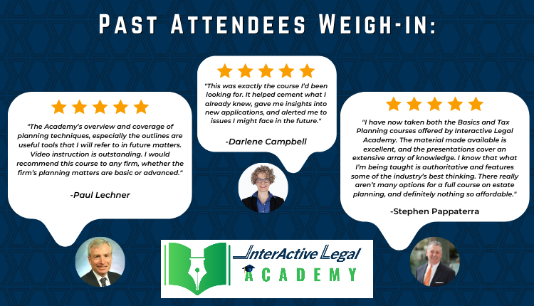 Comment: The InterActive Legal Academy Estate Tax Planning Series has helped fill in holes in my knowledge that I did not even realize were there. I am a much better and more professional practitioner because of Interactive Legal. Thank you!